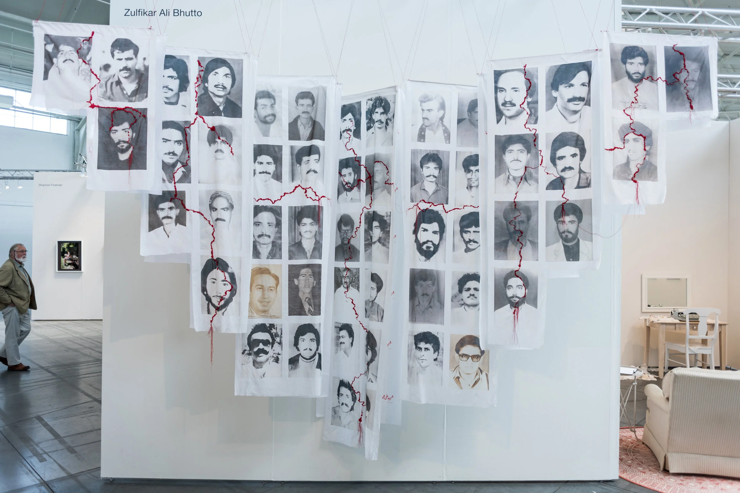 In the Shroud of the Martyr is a fabric installation that shows the faces of 52 martyrs who were killed in Pakistan by successive military regimes and extrajudicial killings even during times of democracy, from Zia-ul-Haq’s take over in 1977 to Pervez Musharaf’s resignation as president in 2007. The images are printed onto cotton lawn, a fabric most often used to cover dead bodies in Muslim burial customs, their names are printed behind their faces, as well as the years of their martyrdom. Thin red thread connects the various panels together.